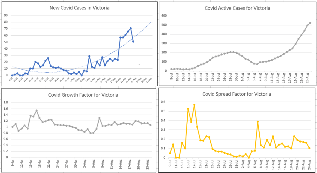 We observed patterns in Active Cases, Growth factor (New cases today/New cases yesterday) with declining spread factor (New Cases today/Active Cases yesterday).  Each active cluster showed a different pattern based on social and cultural characteristics. Overall Victoria was expected to display a pattern similar to Al-Taqwa outbreak.